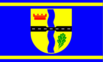 The ratio is approx.. 2:3. It is a blue over yellow horizontal bicolour. The municipal coat of arms is in the centre of the flag.