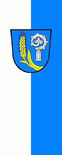 It is either a white vertical monocolour (see left image above) or a white-blue vertical bicolour (see central image above) or a white-blue-yellow vertical tricolour (see right image above). The coat of arms of all is shifted towards the top.