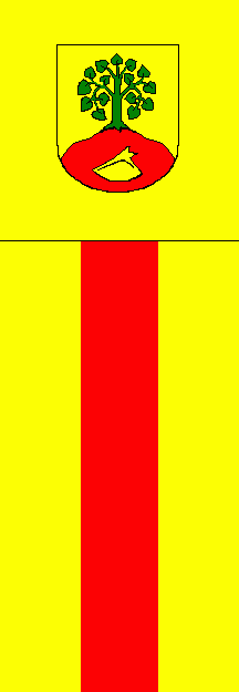 The flag's ratio is 3:5. It is a yellow over red over yellow horizontal triband having a yellow flaghead, which contains the coat of arms.