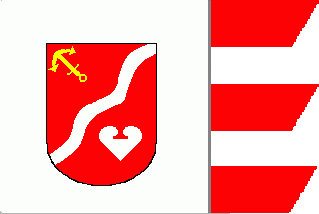It is a red - white - red triband with ratio 1.3.:1. The coat of arms is shifted to the top.