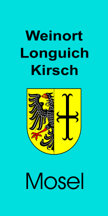 It is a greenish blue vertical monocolour with arms slightly shifted to bottom and a black inscription above (bold) "Weinort" (1st line) "Longuic" (2n line) "Kirsch" (3rd line) and below (bigger) "Mosel"