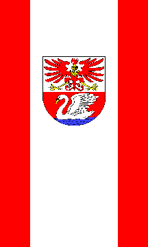 Prenzlau today is the seat of Uckermark County, the largest county in Germany. A settlement of the Dukes of Pomerania existed since 1128, a market and a church since 1188. 1250 the Margraves of Brandenburg acquired the market town. In 1287 city walls were established, and since then the settlement probably had been a city. 1685 Huguenots settled down here. At the end of the 13th century city seals displayed just the eagle of the Margraves of Brandenburg. The helmet is reminding on an episode from 1425. The two mayors of the city surrendered and overhanded the city to the Pomeranians. Next year the margraves regained the city and the mayors had been beheaded. The eagle of Brandenburg since then had a helmet as a mark of abatement. The shape and colour of the helmet changed in the past. The lower half of the shield was added in 1705 by Prussian King Friedrich I, who hunted swans in the region.