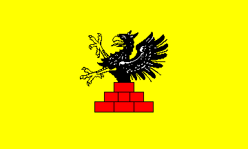 It is an armourial flag (banner of arms) (see central image above). In 1998 Erwin Günther reported a yellow flag (see left image above) with centred arms without shield, i.e. despite of the yellow colour the same flag as before. Both had a red stepped gable had just three steps. In 1998 the flag was replaced (see right image above) by basically the same pattern, showing however the new version of the arms with four steps. The yellow colour of the flag was probably based on the tinctures of the Dukes of Pommern-Wolgast (yellow and black).
