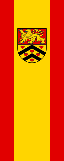 It is a red-yellow-red vertical triband with ratio of stripes 1:3:1. The coat of arms is in the yellow stripe and shifted to the top.