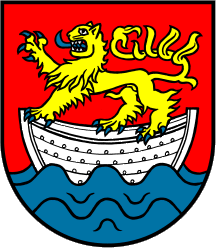 Shield Gules, on base wavy Azure a barge Argent, on barge a lion passant Or, armed and tongued Azure.