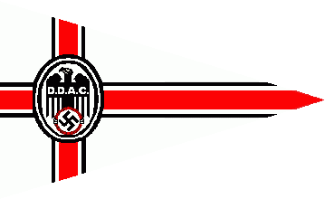 It is a white triangular pennant divided by a red cross cotized white and black, which is shifted to the hoist. The cross is superimposed by a logo. In a white oval cotized black-white-black there is a black eagle holding in his white claws a red wreath with a black swastika (unfortunately it was just the other way round in Germany). Upon the eagle's breast are white dotted letters D.D.A.C. Black-white-red were the German colours.