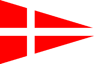 It is a white triangular pennant, divided in the middle by two blue parallel horizontal lines. Shifted to the hoist the lines are superimposed by a red sail over a white sail.
