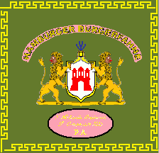 According to source the ratio is approx 4:5. It is an olive green flag. The flag has a golden bordure of oak leaves. Within the bordure are two ovals of the same colour with golden inscriptions. In the middle above the inscription is "Ao. 1813"; in the middle below "den 18. März". In the centre of the sheet are the Greater Arms of Hamburg, shifted to the top. In a silver (= white) shield is a red Hamburg castle. The shield stands on a greyish pedestal with three levels and is supported by two lions rampant, guardant, probably golden. The shield is topped by a helmet, which is crested by five flags in the colours of the five parochial regiments and some peacock feathers. Beneath the arms is a golden inscription, mostle in initials as follows: "St. MICHAELIS REGIMENT" (1st line; slightly bigger) "IV. COMPAGNIE" (2nd line). The flag is a donation of Christian Neumann, a descendant of the company's civic captain having the same name. Please note that the colours of the arms have turned out very pale. Thus their colours are not completely for sure.