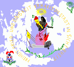 The flags ratio is approx. 12:11. It is a white flag. More than half of the sheet is destroyed (depicted in a light lilac shade). In the centre is a woman. Only her face and the greatest part of her cleavage are kept. She is holding a cornucopia in one arm and a branch of palm in her other hand. She is surrounded by military equipment, most of which is also destroyed and topped by a jehova Sun. Around the woman is a golden circumscription, partially kept. It can be reconstructed as: "Freiheit, Fried und Einigkeit erhält die Stadt in Sicherheit" (Engl.: äFreedom, Peace and Unity keep the City in Securityä). In the lower hoist corner is the coat of arms of an unknown civic captain, displaying in a silver (= white) shield two red roses above and a black bull's head below. Both charges are divided by a blue fess. The shield is topped by a helmet, crested by red plumes. In the upper fly corner is a monogram with the initials äJFPä(?), also nearly completely destroyed. Beneath arms and monogram are pairs of branches of palm, crossed per saltire. The date is not visible, at least not for me. According to filing card it should be 1720.