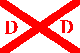 The flag is blue with a white border in three sides, leaving the hoist side out, and a white initial "D" in the center.