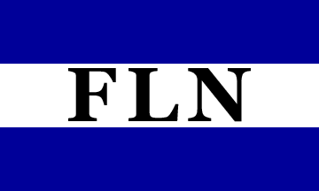 A third version (see right image above) is a 3:5 triband of blue and white with *black* wide bold serifed capitals reading "FLN".