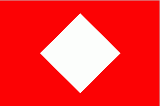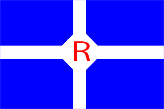 It is a red swallow tail pennant with a white bordure at three sides. In the red filed shifted to the hoist is a white, serifed capital "R".