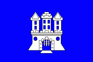 The flag shows in a white field a red castle with open gate supported by two golden(=yellow) rampant reguardant lions, standing on a basement of the same colour.