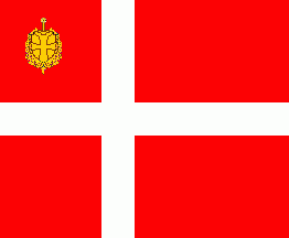 The red flag is parted by an off-centred white cross. In canton is the golden badge of the brigade,