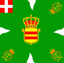 The flag was green with white flames and the arms of the Duchy of Holstein, shield Gules a nettle leaf Argent superimposed by an inescutcheon, parted per fess of Argent and Gules.