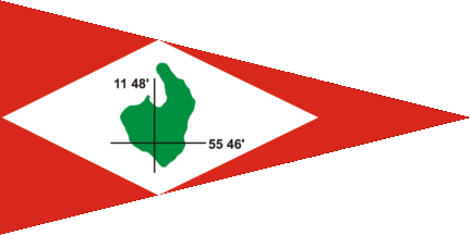 The pennant is red, in hoist is a white fleur-de-lis, in fly a white annulet superimposed by a white initial "M".