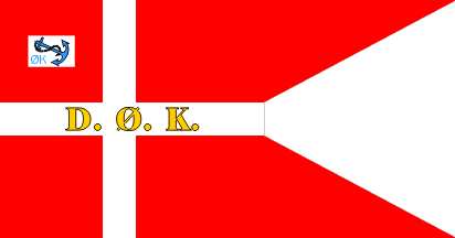 The state ensign defaced with the golden inscription "D. Ø. K." along the horizontal crossbar and with a rectangular patch in the canton containing a light blue top-towards-the-hoist slanted cabled anchor and in its lower hoist corner letters "ØK".
