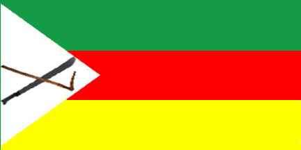 The flag of La América is horizontally divided green-red-yellow with a white triangle placed along the hoist and charged with two cropping tools crossed in saltire.
