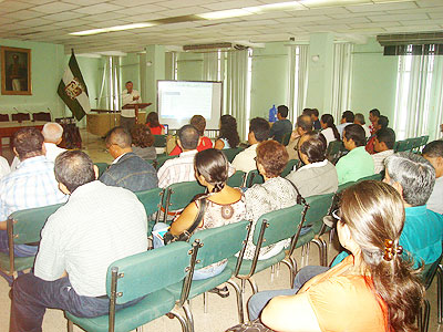 A photograph of a meeting organized by the municipality at www.bahiadecaraquez.com shows the municipal flag on the stand with the municipal coat of arms in the middle, overlapping the two green stripes. There are other photographs of the meeting room with the same flag.