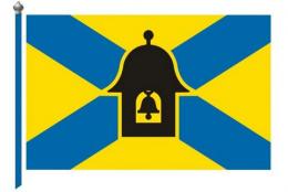 The flag seems to be a banner of the arms: Or on a saltire Azure a bell tower Sable. The design, on both media, is highly stylized, in a non heraldic way — there is a yellow gap/fimbriation where black meets blue.
