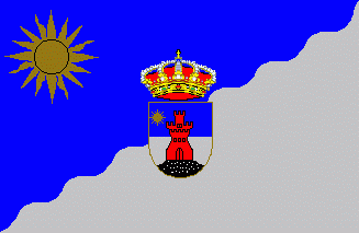 Flag: Rectangular flag in proportions 4:6, divided by a wavy diagonal running from lower left hoist to upper right fly, the upper part azure (sky) with a sun with the geometrical axis placed one third from the hoist, and the lower part argent (sea).