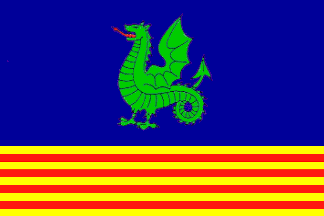 A blue flag with a green dragon, the bottom third horizontally striped with nine stripes yellow red (i.e. the Catalan flag). Almost a banner of the city arms, as it appears in Ralf Hartemink's International Civic Arms website. The dragon is the attribute of St Margaret, the local patron saint.