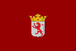 The flag of the Province of León is crimson with the provincial coat of arms in the center, "Argent a lion purpure armed, langued and crowned or. The shield surmounted by a Royal crown open".
