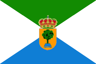 Flag: Rectangular, in proportions 2:3, divided in four parts by the two diagonals, the upper triangle, green, the lower, celestial blue, and the lateral, white. Superimposed in the center with the crowned municipal coat of arms.