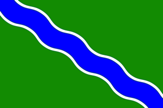 Flag: Rectangular, in proportions 2:3, green with a blue wavy stripe bordered in white diagonally running from the upper hoist to the fly's lower end.