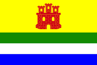 Flag: Rectangular, in proportions 2:3, composed by four horizontal stripes in proportions 1/2, 1/6, 1/6, and 1/6, in descending order, yellow with a red castle, green, white, and blue.