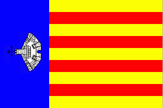 The flag of Minorca, adopted on 14 November 1983, is the Catalan flag with the coat of arms of the Universitat General, the name of the old and once only local administration of the island, offset to the hoist, going from the middle of the second yellow stripe to the middle of the fourth.