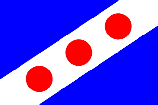 Flag: Rectangular flag with proportions 2:3, made of a blue panel with a white diagonal stripe charged with three red disks, running from the lower hoist to the upper fly.