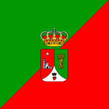 Flag: Quadrangular flag, per bend vert and gules. In the middle is placed the municipal coat of arms in full colors. The staff surmounted by a Royal crown closed. Staff surmounted by a Royal crown closed. Quadrangular with proportions 1:1. Division: Per bend. Colors: Vert (green) on top and gules (red) on bottom.