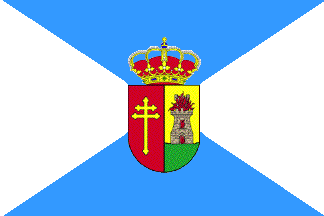 Flag: In proportions 2:3. Divided per saltire, the lower and upper parts, blue, the lateral parts, white, in the center, the crowned municipal coat of arms.