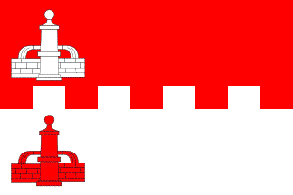 Flag: Rectangular flag in proportions 2:3, horizontally divided, embattled of five pieces, on top red with a white fountain at 1/3 of the hoist, on bottom white with a red fountain at 1/3 of the hoist.