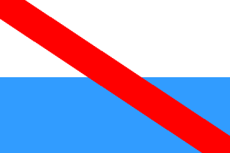 The flag of Suances is horizontally divided white-blue with a red diagonal stripe from top hoist to bottom fly.