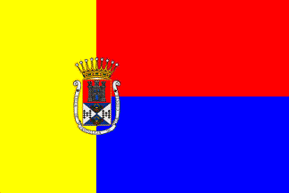 Flag: Rectangular panel, with the length one and a half the hoist, made of a vertical yellow stripe placed at hoist and covering 1/3 of the panel; the remaining 2/3 of the panel divided into two equal horizontal stripes, the upper Bordeaux red and the lower sea blue. The municipal coat of arms placed over the confluence of the three stripes of the flag.