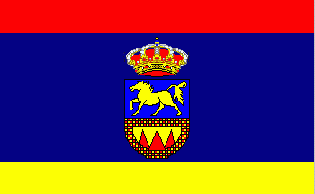 Flag: Rectangular, in proportions 11 x 18, made of three parallel stripes perpendicular to the hoist, the first, red and the third, yellow, each of 1/6 of the flag's width, and the second, blue, of 4/6. In the center the local coat of arms.