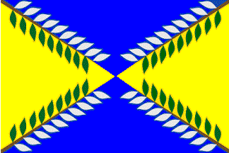 Flag: Quadrangular, in proportions 3:2, quartered per saltire with the quarters counterchanged. The hoist and fly panels, reseda yellow. The top and bottom panels, Prussian blue. The division of the fields, charged with four branches of olive tree in natural size, which start from the flag's angle and converge to its center, without touching it. The leaves are olive green when placed on the yellow field and pearl gray or silver when placed on the blue field.