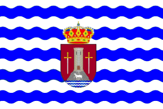 The coat of arms is "Purpure a tower argent masoned port and windows sable on a mount proper charged with a sheep argent surrounded by two swords argent hilted or pointing downwards a base fessy wavy azure and argent. The shield surmounted by a Royal Spanish crown."