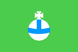 Green with a centred white orb with blue bands, as high as 7/9 of the flag's height. Ratio 2:3.