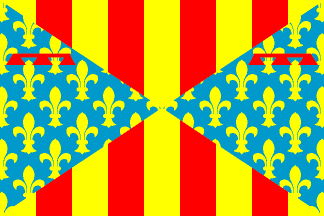 Flag quartered saltirewise, the top and bottom triangles showing nine stripes yellow-red-etc. (YRYRYRYRY), the hoist and fly triangles blue strewn with yellow fleurs-de-lys each as high as 3/16 of the flag's height and as wide as 1/12 of the flag's length, six of them [on each triangle] complete and fully visible. On the top part of the hoist and fly triangles, a red [heraldic] label of three points, as wide as 3/128 of the flag's height and as long as 43/192 of the flag's length, separated from the top 1/4 [of the flag's height] and from the hoist and fly, respectively, 1/96 [of the flag's length].