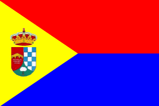 Flag: Composed of two horizontal stripes, parallel and of the same size, the upper, red, and the lower, blue. The tight part of the flag covered by a yellow triangle reaching the center. On this yellow field, centered, the coat of arms of Alcañizo.