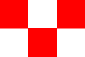 Flag: Rectangular flag, with proportions 1:1, made of a six equal quadrilaterals, red and white in turn, the quadrilaterals at upper and lower hoist and at mid fly red, the other quadrilaterals white.
