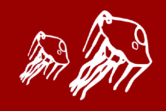 The flag, primarily white with two cyan magenta jeelyfishes, is also sold in different colours (red with white jellyfishes; yellow with with black jellyfishes).