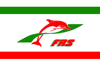 An earlier version of the house flag is white with a red horizontal stripe near the top and a green horizontal stripe near the bottom. In the center, the red and white dolphin jumping over a green wave and the letters "FRS", red with a green shadow.
