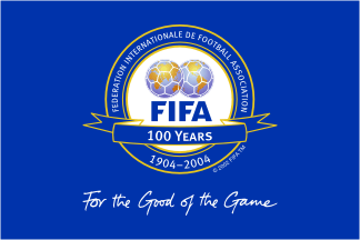 The image of the flag of the FIFA shows it to be blue, with on it two footballs, their height about a third of the flag's height, drawn in white, side by side, the dexter slightly obscuring the sinister. Through the colouring of their surfaces, the balls together form a map of the world in shades of blue, yellow and brown, with Africa dexter and America sinister. Below the balls are the letters FIFA in white, approximately a fifth of the flag in height. Below this is the text "For the Good of the Game" in white, in a pseudo hand-written script, approximately one eighth of the flag in height.