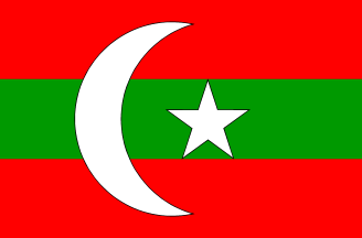 A red-green-red horizontal tricolour charged with a white crescent and star, each with a black outline. This image shows a different crescent and the star in a different position.