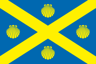 The flag is a banner of the municipal coat of arms, D'azur au sautoir d'or cantonné de quatre coquilles du même ("Azure a saltire or cantonned with four scallops of the same").
