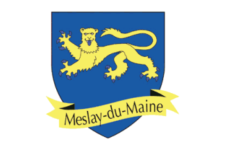 The flag of Meslay-du-Maine (photo) is white with the municipal coat of arms, "Azure a lepoard or", wrapped in a scroll or inscribed with the name of the muncilaity.